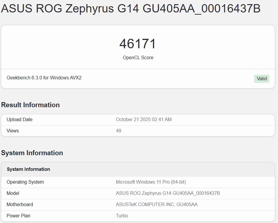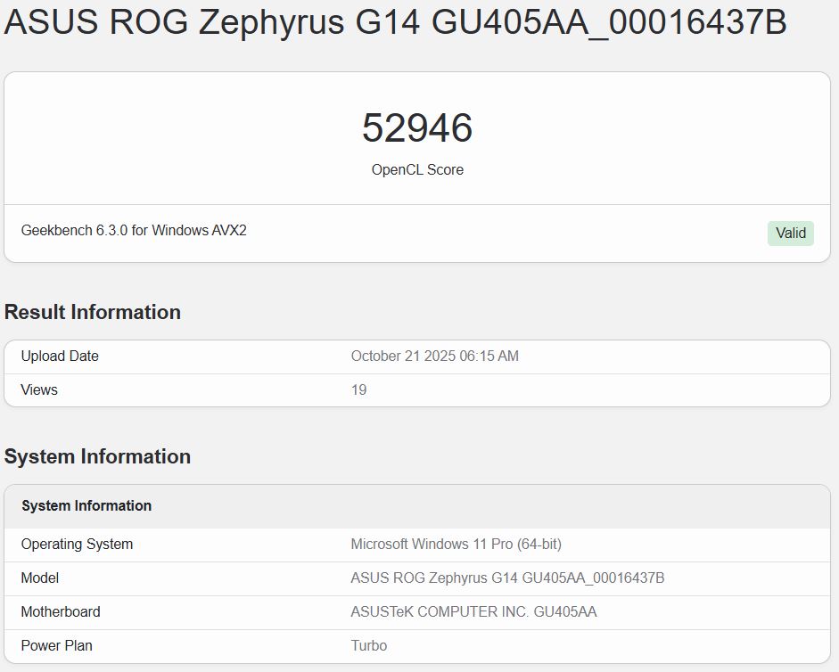 Au plus haut niveau, l'iGPU du Core Ultra X7 358H dans le ROG Zephyrus G14 a obtenu un score de 52 946 dans le benchmark Geekbench 6.5 OpenCL. À l'extrémité la plus basse, le score était de 46 171. Il y a également d'autres listes avec des scores se situant entre ces deux chiffres.