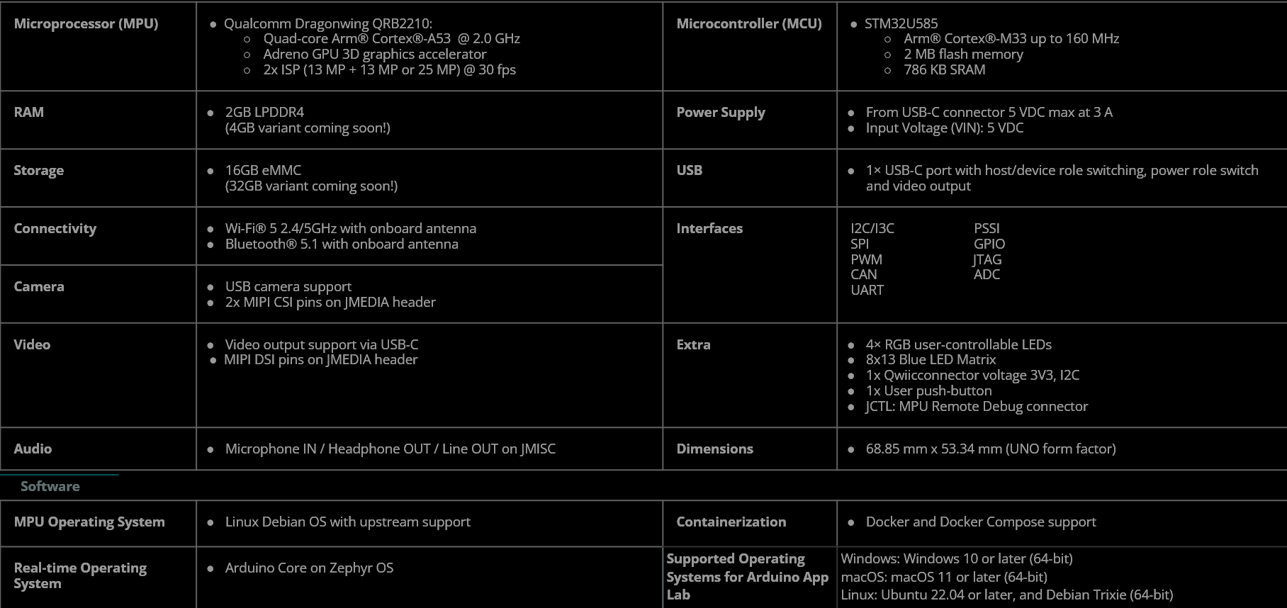 Arduino a ajouté un nouvel ordinateur monocarte à la famille UNO, baptisé Arduino UNO Q. Il est doté d'une foule de fonctionnalités de connectivité telles que le Wi-Fi 5, le Bluetooth 5.4 et l'USB-C. En son cœur, il utilise un microprocesseur Qualcomm Dragonwing QRB2210 avec quatre cœurs de CPU Arm Cortex-A53 et un GPU Adreno non spécifié. Un microcontrôleur STMicroelectronics STM32U585 avec un Arm Cortex-M33 l'accompagne.
