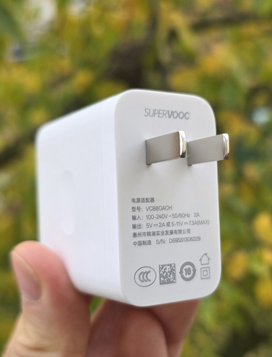Le chargeur SuperVOOC inclus charge le smartphone phare à une puissance maximale de 80 watts (11 V, 7,3 A) et ne pèse qu'environ 106 grammes. Oppo est un peu trop "traditionnel" en ce qui concerne le port USB, puisqu'il n'utilise que des connecteurs de type A. Logiquement, le câble USB fourni n'a lui aussi qu'un connecteur de type A et non le connecteur plus moderne USB-C à USB-C. Étant donné que de moins en moins d'ordinateurs portables utilisent cette ancienne norme, il est grand temps qu'Oppo mette à jour ses adaptateurs d'alimentation.
