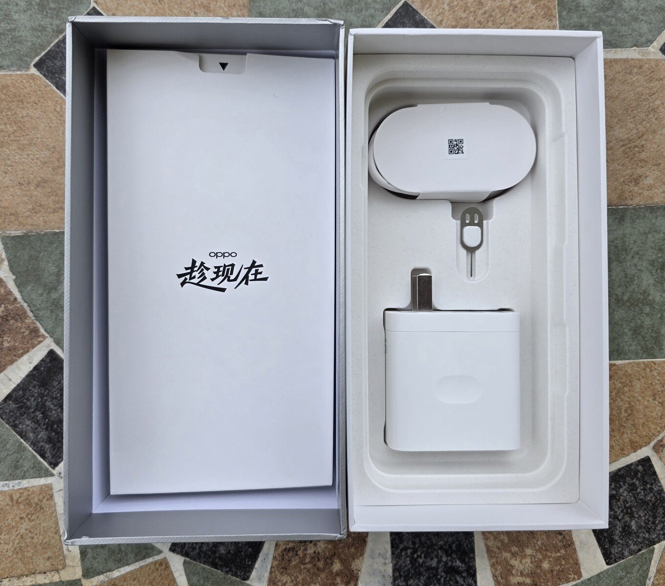 Avant même de déballer le produit, on remarque que la boîte est très volumineuse par rapport aux normes actuelles. Cela est dû au chargeur rapide, qui n'est fourni qu'avec le modèle chinois du Find X9 Pro. Les acheteurs du modèle international doivent utiliser un chargeur séparé.