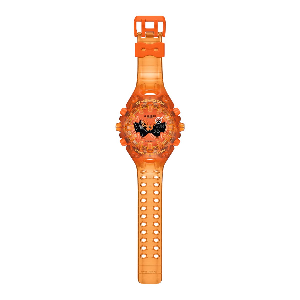 Le Pack Transparent numérique-analogique se compose des modèles GA-V01SKE-3A (vert fluo), GA-V01SKE-4A (orange), GA-V01SKE-6A (violet) et GA-V01SKE-8A (noir), chaque modèle étant doté d'un grand écran LCD inversé ressemblant à des yeux d'extraterrestre. La variante orange https://www.casio.com/jp/watches/gshock/product.GA-V01SKE-4A/ est l'édition la plus remarquable et semble remplacer le modèle argenté de la gamme originalele modèle orange remplace apparemment le modèle argenté de la gamme originale, qui a été lancé pour la première fois en Chine en février de l'année dernière.