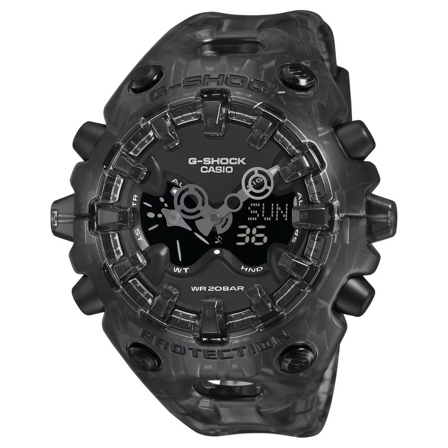Casio a rafraîchi son GA-V01 avec quatre nouveaux modèles transparents. Le nouveau Transparent Pack conserve le style futuriste de la montre, inspiré des extraterrestres, mais remplace les boîtiers pleins par des coques transparentes de type squelette, tout en introduisant une toute nouvelle couleur orange.