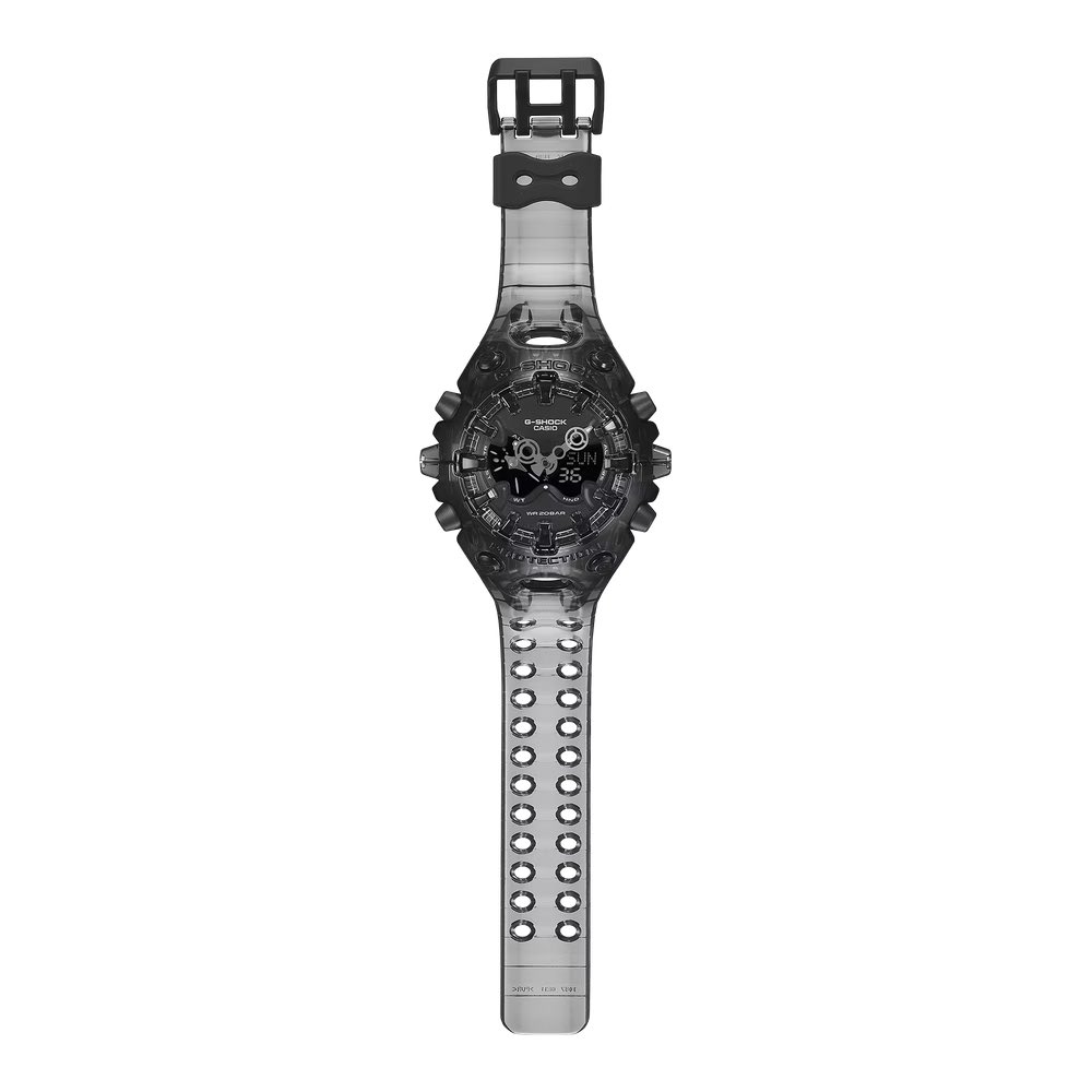 Malgré sa transformation transparente, la GA-V01SKE ne fait aucun compromis sur la durabilité et la robustesse qui font la réputation de la G-Shock. Comme les modèles originaux, elle utilise la même construction intégrée de la lunette et de la bande pour protéger le module central. Les énormes index en 3D qui surplombent le verre ne sont pas non plus là pour faire joli, puisqu'ils servent en fait de pare-chocs pour absorber les chocs.