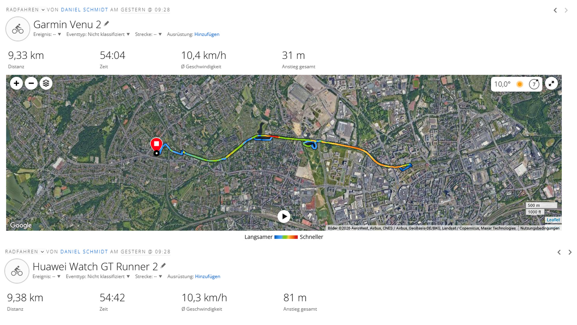 Dans une comparaison GNSS avec la Garmin Venu 2, la smartwatch de Huawei donne de bons résultats et suit l'itinéraire avec plus de précision, en particulier entre les bâtiments. Cependant, elle n'est pas parfaite non plus, nous plaçant parfois à une certaine distance de l'itinéraire lorsque nous étions au lac.