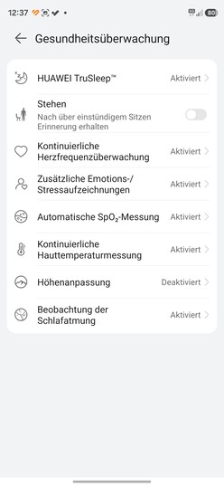 Comme d'habitude, la smartwatch de Huawei suit automatiquement un large éventail de paramètres de santé et permet également un suivi manuel. Il s'agit notamment de la fréquence cardiaque, de l'analyse du pouls, de la saturation en oxygène du sang (SpO2), des niveaux de stress ou de bien-être, de la variabilité de la fréquence cardiaque (VFC) et de la température de la peau. Cette dernière peut être utilisée pour le suivi du cycle. Vous pouvez également mesurer manuellement la rigidité artérielle et créer des ECG. La fonction de suivi du sommeil TruSleep est également de retour.
