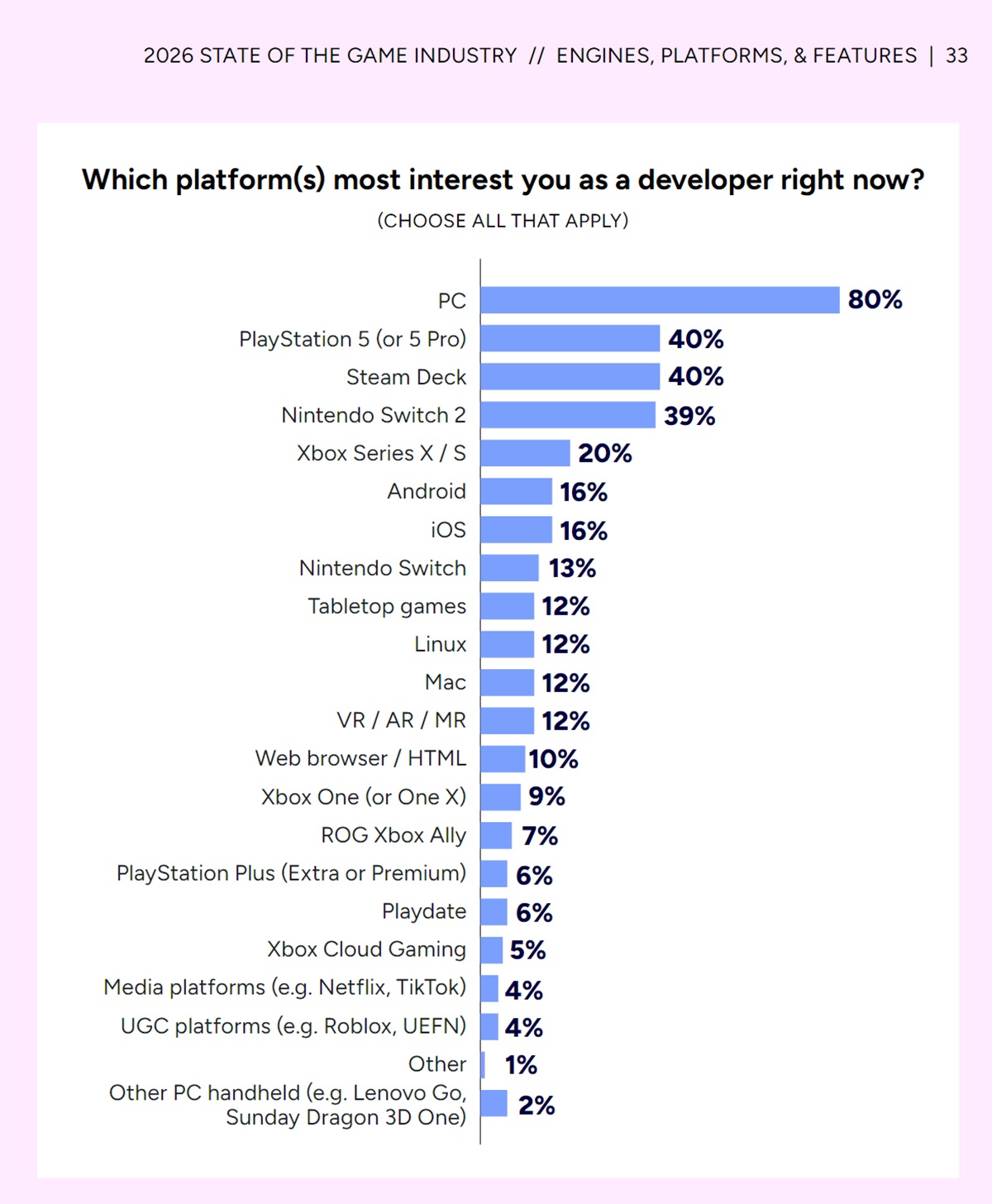 Comme dans le rapport 2025, les jeux sur ordinateur de bureau et portable restent une priorité absolue pour ces créateurs. Aucune console individuelle ne dispose de la même base d'utilisateurs massive, et les et les places de marché populaires comme Steam ont moins de restrictions. Ce soutien s'étend même à Steam Deck, basé sur Linux, qui a obtenu un score impressionnant de 40 %.