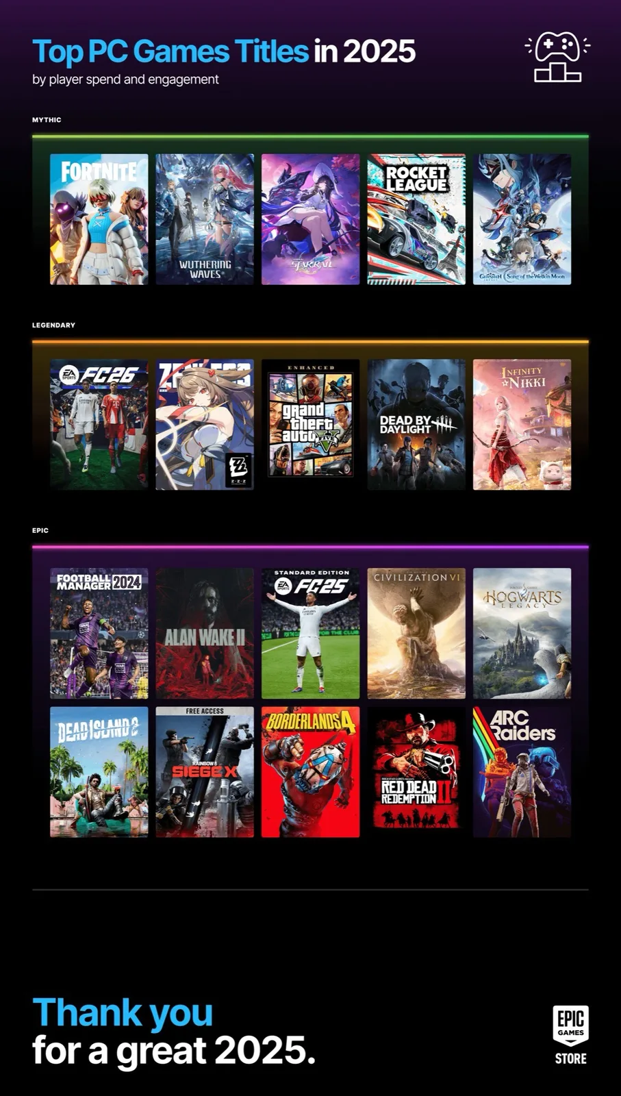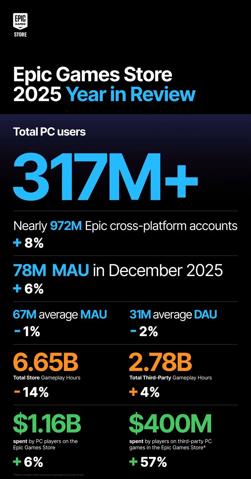 En 2025, l'Epic Games Store a réussi à battre plusieurs de ses propres records, puisque l'alternative à Steam a enregistré 78 millions d'utilisateurs actifs mensuels l'année dernière, qui ont dépensé plus de 400 millions de dollars en jeux tiers au total, sans compter Fortnite. Au total, les clients ont passé 2,78 milliards d'heures à jouer à des jeux tiers, dont une grande partie est probablement attribuable aux jeux gratuits hebdomadaires.