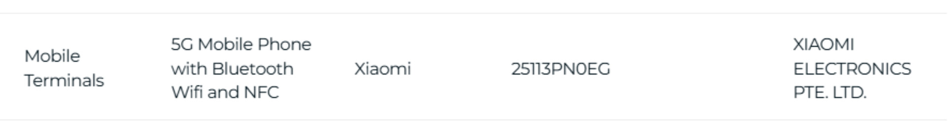 Aujourd'hui, ce qui semble être la version mondiale du Xiaomi 17 est apparu dans la base de données publique de l'Infocomm Media Development Authority (IMDA) à Singapour. Plus précisément, l'organisme de réglementation a certifié le modèle "25113PN0EG", comme le montre l'image ci-dessous. D'après la nomenclature des numéros de modèle de Xiaomi, 25113PN0EG devrait être la version mondiale de 25113PN0EC, un numéro de modèle attribué à la version chinoise du Xiaomi 17.