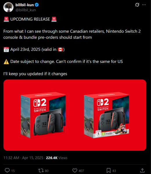 La date de précommande de la Switch 2 pour les Canadiens était initialement prévue le 9 avril, avant que Nintendo ait annoncé un retard. Coïncidant avec les nouveaux tarifs douaniers de Trumples joueurs canadiens se sont sentis contrariés car ce n'était pas la politique de leur gouvernement. Nintendo a expliqué qu'elle coordonnait la sortie de la console entre les deux pays. Quoi qu'il en soit, billbil-kun, auteur de fuites respectées, affirme aujourd'hui que les précommandes au Canada commenceront le 23 avril https://x.com/billbil_kun/status/1912167208140108026.
