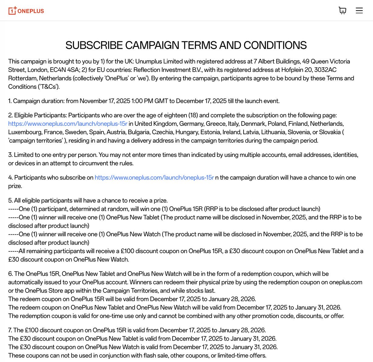 En d'autres termes, la mesure dans laquelle le OnePlus 15R remplacera le OnePlus 13R (actuellement à 599 $ sur Amazon) reste pour l'instant incertain. Cela dit, vous pouvez d'ores et déjà vous inscrire pour bénéficier d'une remise de lancement de 200 € ou d'une chance de gagner gratuitement un OnePlus 15R. D'après les conditions générales du concours ( ), OnePlus prévoit de lancer le OnePlus 15R à la fin de l'annéeonePlus prévoit de lancer le OnePlus 15R après le 17 décembre, probablement le 18 décembre si l'on en croit les conditions du tirage au sort de l'équivalent du OnePlus 15 sur https://www.oneplus.com/uk/launch/oneplus-15/subscribe-to-win-tc. Entre-temps, les remises accordées aux acheteurs précoces seront valables jusqu'au 28 janvier 2026, ce qui soulève la question de savoir quand les précommandes commenceront à être expédiées à ce stade.