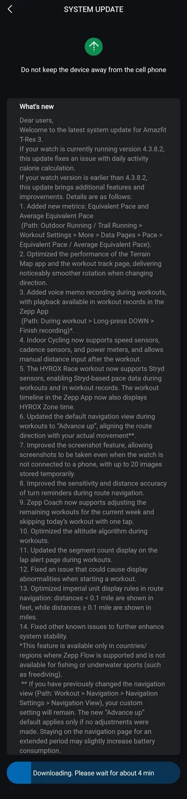 Les utilisateurs de la smartwatch Amazfit T-Rex 3 peuvent désormais enregistrer des mémos vocaux pendant les séances d'entraînement, et la carte du terrain et la page de suivi des séances d'entraînement ont toutes deux été améliorées. Vous trouverez ci-dessous la liste complète des modifications apportées à la version 4.3.8.4 du logiciel. Nous ne savons pas encore quand le déploiement de cette nouvelle mise à jour sera terminé. Lorsqu'elle sera disponible, vous pourrez installer cette mise à jour de l'Amazfit T-Rex 3(actuellement 249,99 $ chez Amazon) via l'application Zepp.