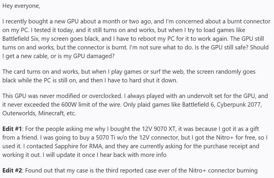 Bien que Nvidia ait utilisé une version révisée du connecteur dans la série RTX 50, il y a encore eu des rapports sur le nouveau connecteur 12V-2xWR qui a fondu à gauche et à droite rapports sur les nouveaux câbles 12V-2x6 défaillants. La décision d'AMD de ne pas utiliser le 12VHPWR et le dernier 12V-2x6 a évité à la société de nombreux cauchemars en matière de relations publiques. Cependant, il existe encore quelques modèles AIB Radeon qui utilisent le 12VHPWR/12V-2x6. L'une de ces cartes est la Sapphire Nitro+ RX 9070 XT qui, selon un post sur r/pcmasterracea été victime d'un connecteur 12VHPWR grillé.