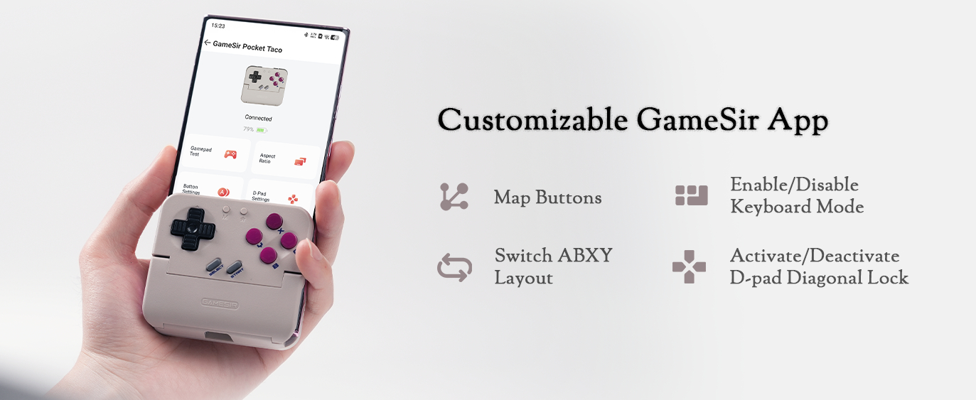 La manette fonctionne avec l'application GameSir qui offre aux utilisateurs une poignée d'options de personnalisation telles que le réglage du rapport d'aspect/de l'échelle d'affichage, la modification de la disposition des boutons (Switch ou Xbox), l'échange des touches L1 et L2 ou R1 et R2, l'activation du verrouillage diagonal de la D-pad et l'activation d'un mode clavier.