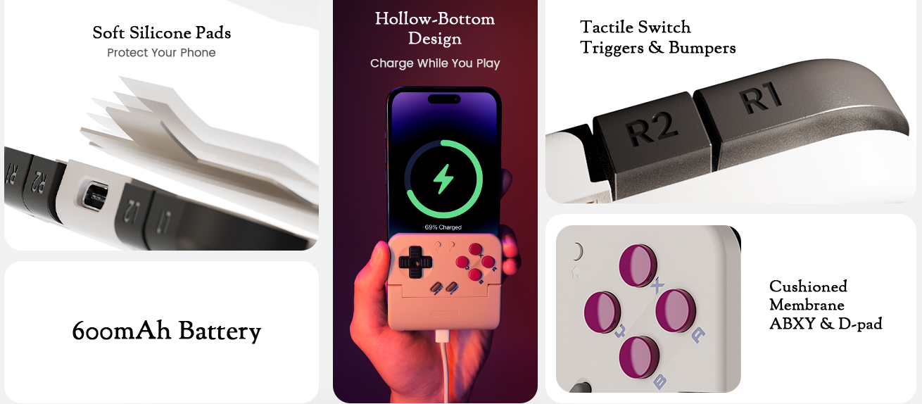 Le GameSir Pocket Taco se connecte à un smartphone compatible via Bluetooth et se fixe à l'appareil grâce à un mécanisme de pince. L'intérieur de la manette est doublé de coussinets en silicone souple pour protéger votre téléphone. La manette est dotée d'un pavé numérique à membrane et de boutons ABXY, tandis que les gâchettes et les pare-chocs sont dotés d'interrupteurs tactiles.