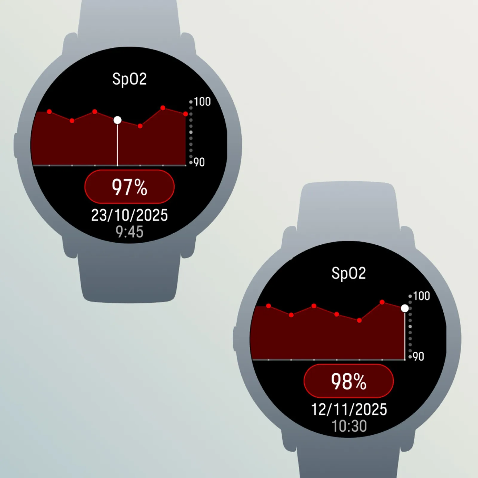 La mise à jour de la smartwatch introduit principalement des fonctions pratiques. Avec Polar OS 5, il est désormais possible de régler plusieurs alarmes directement sur la smartwatch, et les cadrans de montre bénéficient d'un mode nuit. Tant que le mode "Ne pas déranger" est activé, l'écran ne s'allume que légèrement lorsqu'on appuie sur un bouton, tandis que certains cadrans de montre peuvent désormais afficher un format d'heure plus minimaliste. De plus, un nouveau graphique permet d'afficher la saturation en oxygène du sang au fil du temps.