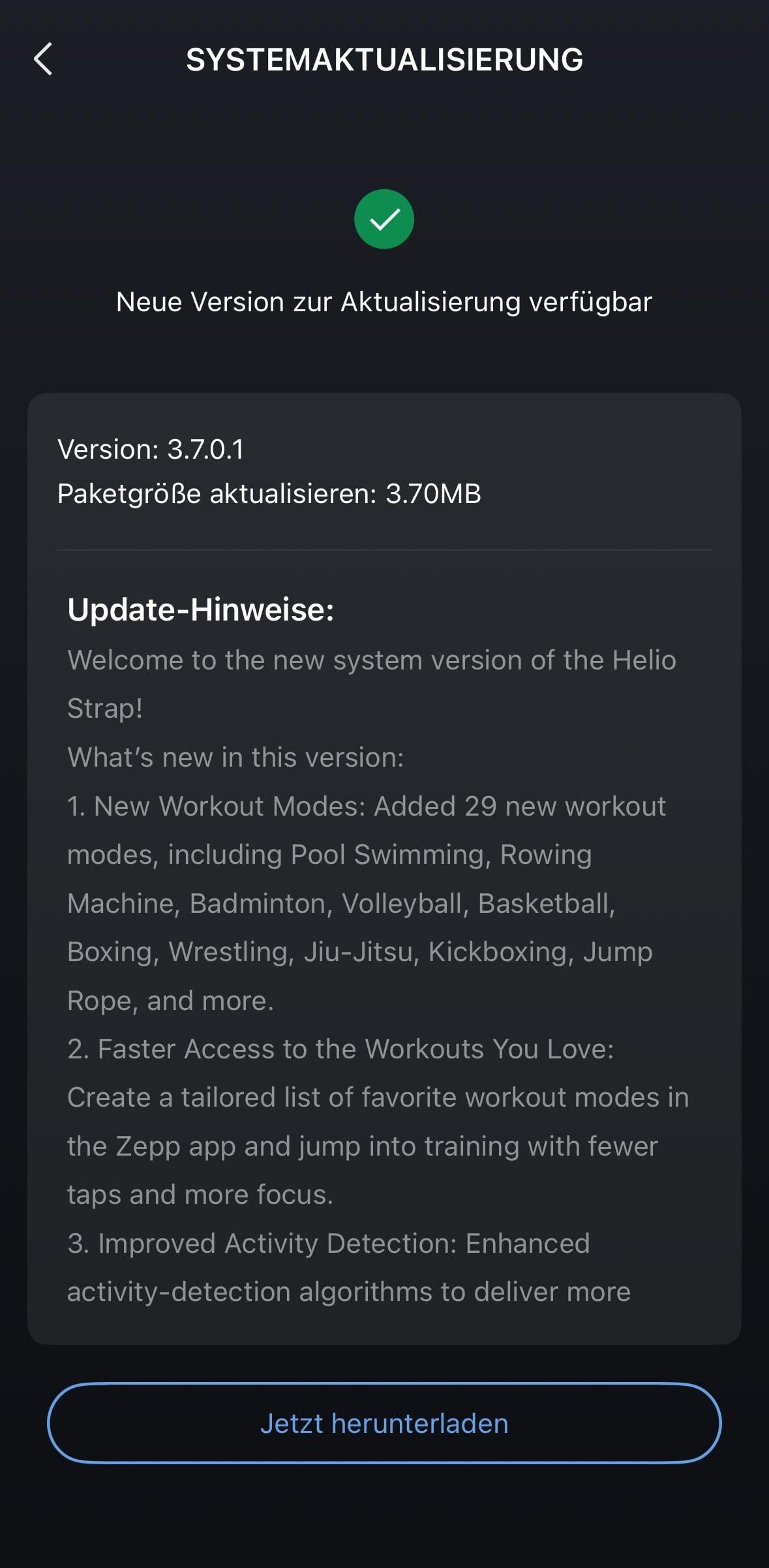 La version 3.7.01 du logiciel a été signalée sur Reddit ( ) comme étant un fichier de 3,70 Mo un fichier de 3,70 Mo. Elle apporte une multitude de nouveaux modes d'entraînement à l'Helio Strap. Les 29 nouvelles options comprennent la natation en piscine, le rameur, le badminton, le volley-ball, le basket-ball, la boxe, la lutte, le jiu-jitsu, le kickboxing et la corde à sauter. La liste complète des nouvelles activités n'a pas encore été révélée. Il semble toutefois que le golf ne fasse pas partie de ces modes.
