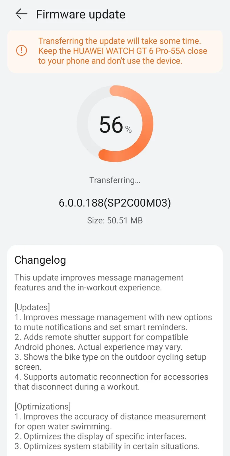 Les notes de mise à jour des versions de la Watch GT 6 et de la Watch GT 6 Pro présentent de nombreuses similitudes. Elles mentionnent toutes deux la prise en charge d'une gestion améliorée des notifications, les utilisateurs pouvant configurer des notifications silencieuses et des rappels intelligents. Les utilisateurs d'appareils Android peuvent désormais contrôler à distance l'appareil photo de leur smartphone depuis la montre, et il existe une optimisation liée à Alipay. De plus, il a été rapporté sur en Chine qu'une version améliorée de la montre serait en cours de développement en Chine qu'une version améliorée de l'application WeChat, la version 1.1.0, ajoute la prise en charge de la messagerie voix-texte.