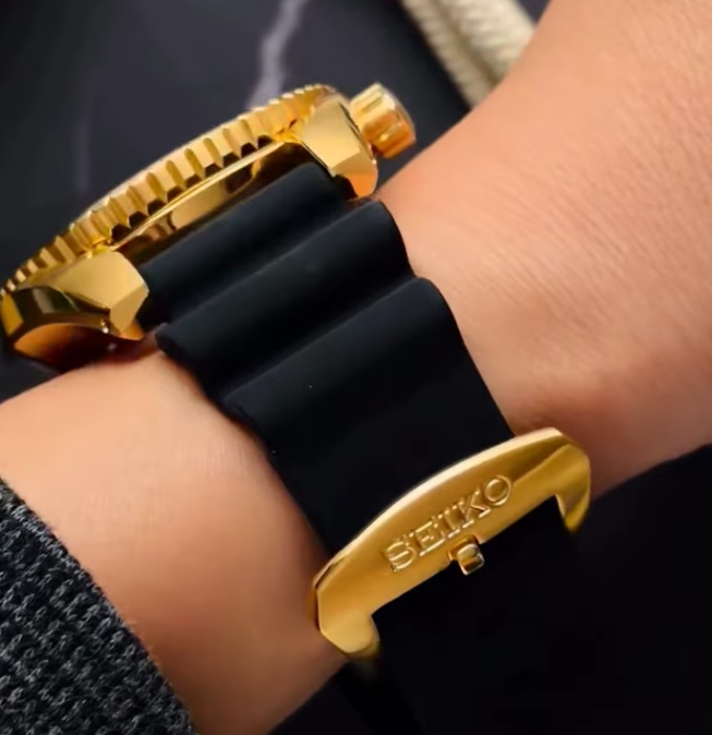 La lunette reste pratique. Elle comporte un insert noir avec des repères de minutes en or. Sur les photos officielles du produit, l'ensemble du boîtier, du bracelet et du fermoir est fini dans le même ton d'or chaud, et les côtés du boîtier semblent entièrement polis, tandis que le bracelet semble mélanger des surfaces brossées et polies. La nouvelle vidéo confirme cette impression : lorsque la caméra fait un panoramique sur le flanc du boîtier, les reflets sont lisses plutôt que granuleux, ce qui signifie que Seiko a réalisé un travail de finition assez propre pour une montre qui est toujours destinée à être utilisée comme un outil.