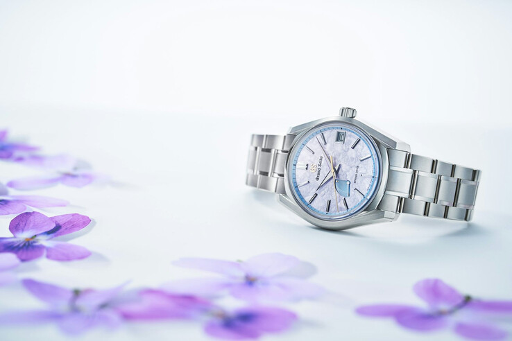 La palette de couleurs fait référence à la fleur "Sumire" (violette). Le cadran présente une douce teinte gris-violet, ainsi qu'un indicateur de réserve de marche bleu et un anneau périmétrique bleu. Grâce à des éléments dorés, dont le logo GS et l'aiguille des secondes, le contraste est saisissant avec le motif texturé "Hana-ikada", destiné à imiter les fleurs de cerisier flottant sur l'eau.