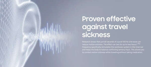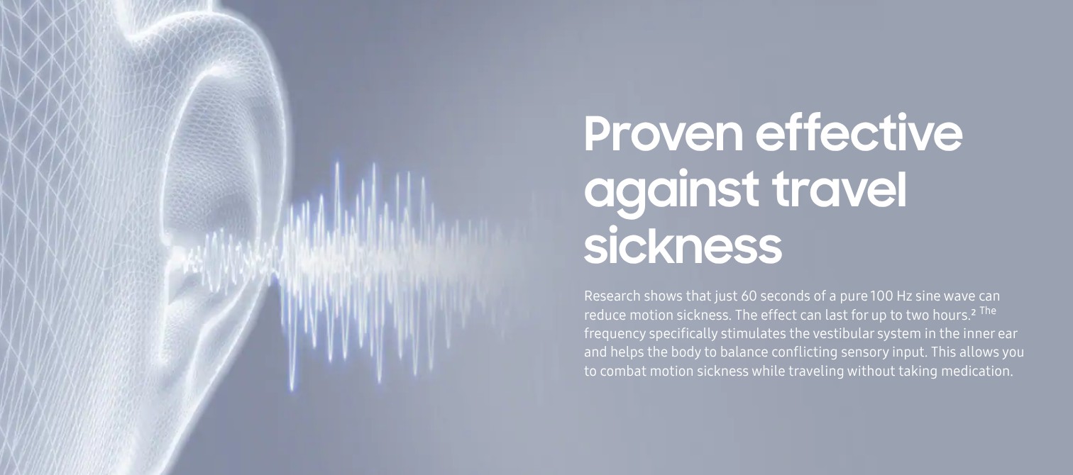 Samsung appelle cette nouvelle application Hearapy et affirme qu'elle est conçue pour aider à réduire le mal des transports. Pour ce faire, elle diffuse une tonalité sinusoïdale de 100 Hz qui stimule le système d'équilibre de l'utilisateur, réduisant ainsi le mal des transports sans qu'il soit nécessaire de prendre des médicaments.