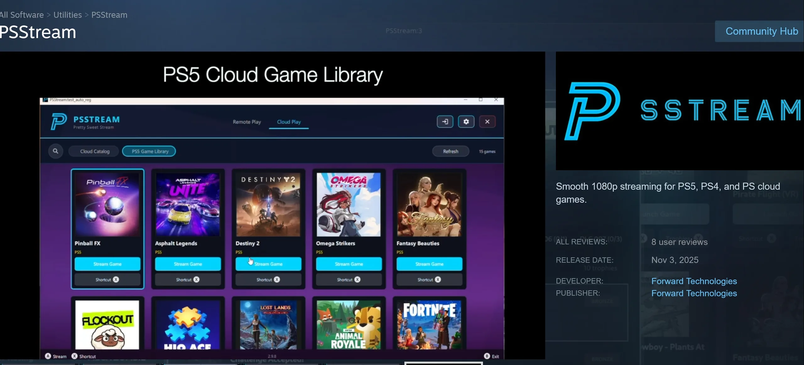 Comme le montre une vidéo de son développeur, PSStream comporte des onglets pour le jeu à distance et le jeu en nuage. Dans la section Cloud Play, les joueurs peuvent parcourir un catalogue de titres par abonnement. Le menu de la bibliothèque de jeux de la PS5 est plus intrigant, car il affiche d'autres options compatibles que les utilisateurs ont déjà achetées.