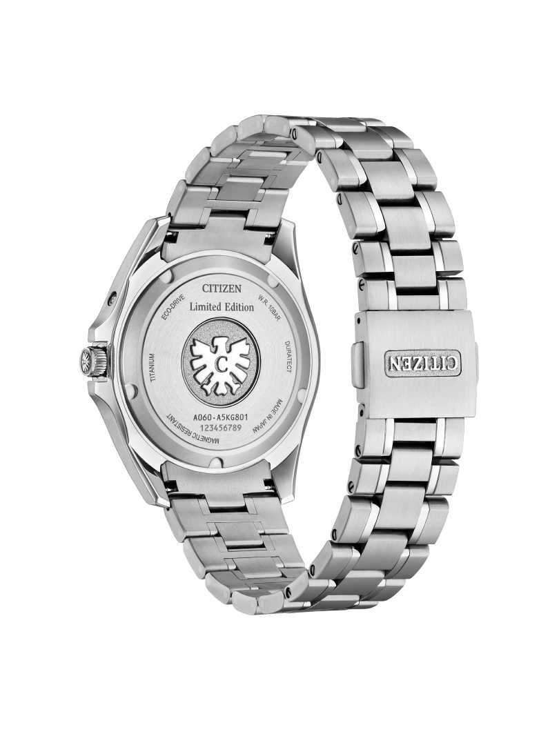 Le boîtier de 40,0 mm par 12,2 mm et le bracelet assorti sont fabriqués dans le matériau Super Titanium exclusif de Citizen, puis traités avec un revêtement Duratect Platinum, ce qui donne une montre 40 % plus légère qu'une montre standard en acier inoxydable et environ cinq fois plus dure, tout en étant résistante à la corrosion et respectueuse de la peau.