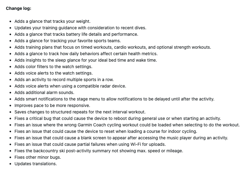 Bien que le journal des modifications (capture d'écran ci-dessous) énumère de nombreux changements, certains d'entre eux étaient déjà inclus dans des versions antérieures. La version bêta 16.28 propose de nouveaux sons d'alarme et la possibilité de retarder les notifications jusqu'à la fin d'une activité, grâce à l'ajout de ces sons dans le menu d'étape. De plus, Garmin Connect Mobile Translations a été mis à niveau vers la version 3.50.
