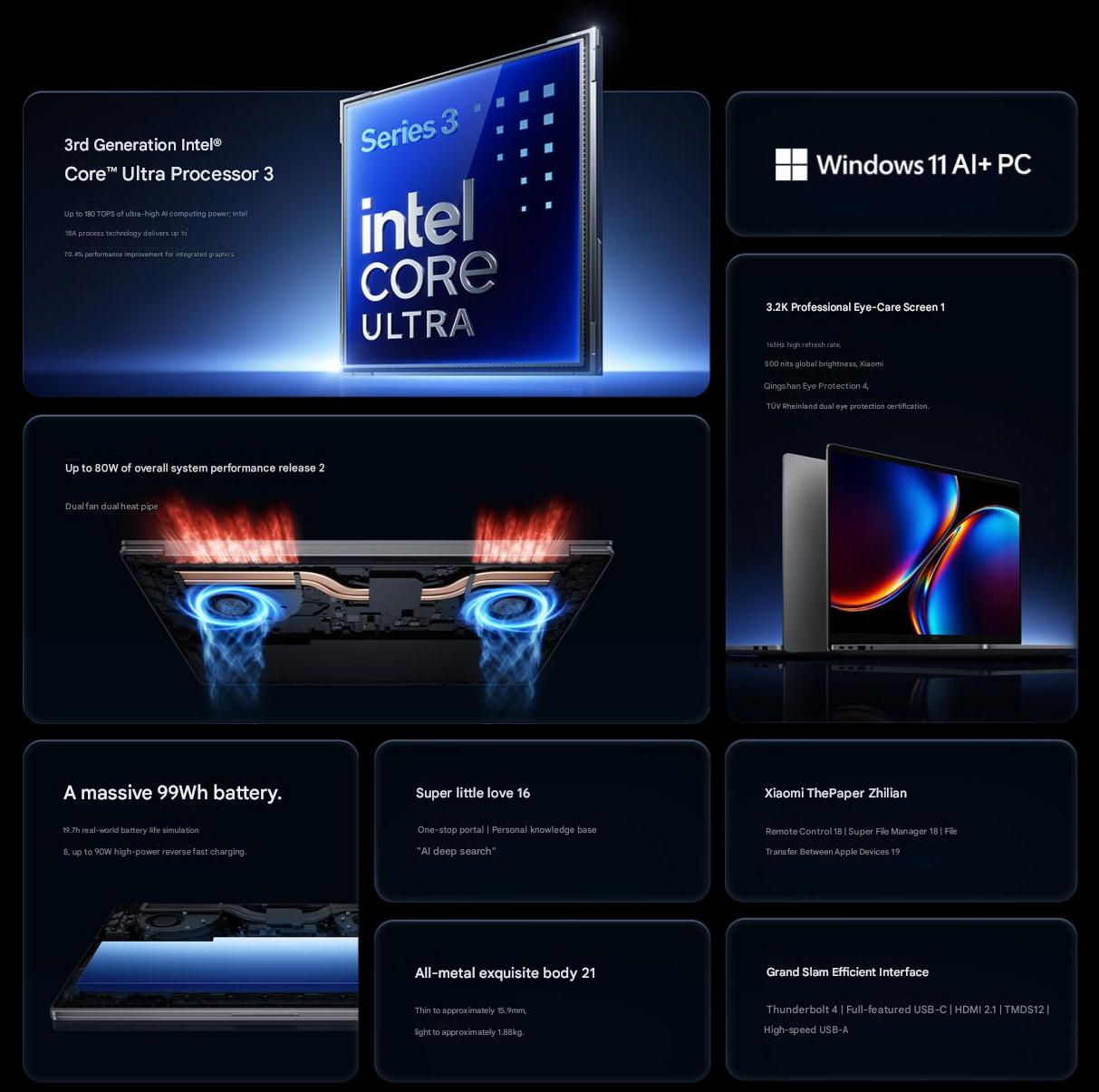Trois configurations principales sont disponibles pour les deux, et l'option de base intègre l'Intel Core Ultra 5 325, un processeur de milieu de gamme de la gamme. Il est associé à 24 Go de RAM et 1 To de stockage. La deuxième configuration passe au Core Ultra 5 338H, une option plus performante avec l'iGPU Arc B370. Xiaomi a associé cette option à 32 Go de RAM et 1 To de stockage.