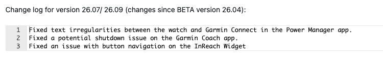 Par ailleurs, le journal des modifications de la version bêta 26.09 de la Fenix 7 est presque identique. Elle contient trois corrections de bugs, dont l'une concerne un problème avec l'application Power Manager, où le texte sur la montre ne correspondait pas à celui affiché dans l'application Garmin Connect. Un problème pouvant entraîner l'arrêt de ces smartwatches lors de l'utilisation de l'application Garmin Coach a été résolu, de même que des irrégularités de texte entre la montre et Garmin Connect dans l'application Power Manager. De plus, un bogue lié à la navigation sur les boutons du Widget InReach a été corrigé.