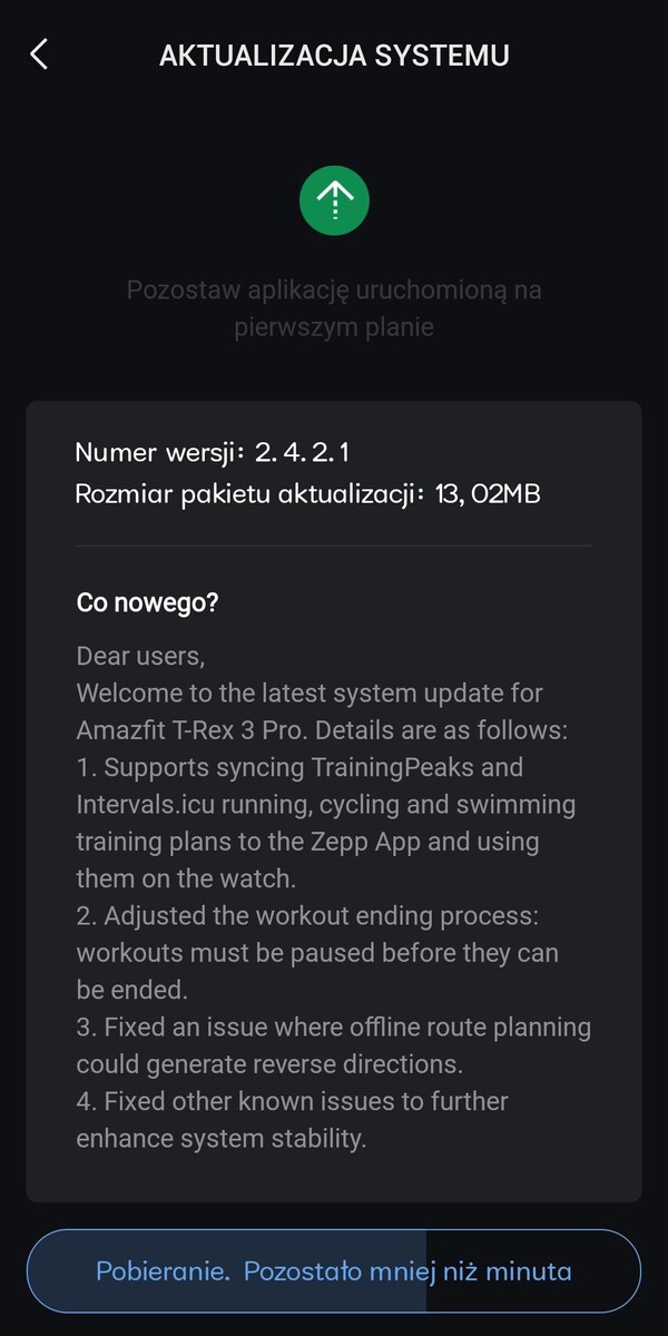 La version 2.4.2.1 du logiciel a été signalée par des utilisateurs de la T-Rex 3 Pro sur Reddit. Le journal des modifications partagé (ci-dessous) indique que la version apporte des intégrations améliorées avec TrainingPeaks et Intervals.icu. Vous pouvez désormais synchroniser des plans d'entraînement de course à pied, de cyclisme et de natation avec l'application Zepp, et ces plans sont également accessibles sur la smartwatch. Autre changement lié à l'entraînement : les utilisateurs doivent désormais mettre en pause une séance d'entraînement avant de pouvoir la terminer.