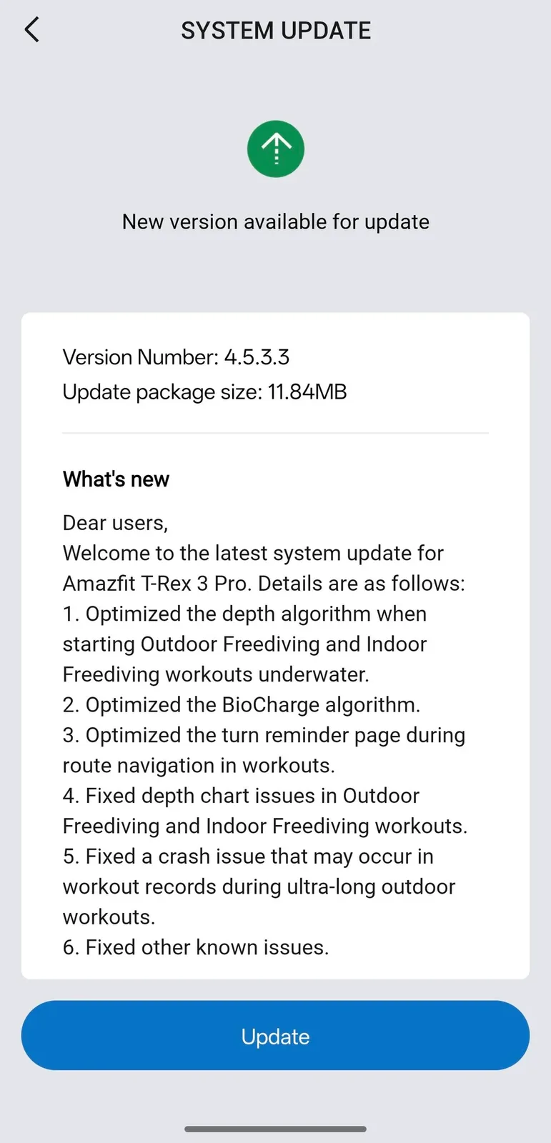 La version 4.5.3.3 du logiciel a été signalée par des utilisateurs de la smartwatch Amazfit T-Rex 3 Pro sur Reddit ( ). Ce fichier de 11,84 Mo apporterait des optimisations à l'algorithme de profondeur, liées aux entraînements Outdoor Freediving et Indoor Freediving. Des améliorations auraient également été apportées à la page de rappel de virage, qui est servie aux utilisateurs au milieu de l'entraînement lorsqu'ils utilisent la fonction de navigation sur l'itinéraire. De plus, Zepp Health indique avoir amélioré l'algorithme BioCharge, sans toutefois quantifier les avantages pour les utilisateurs.