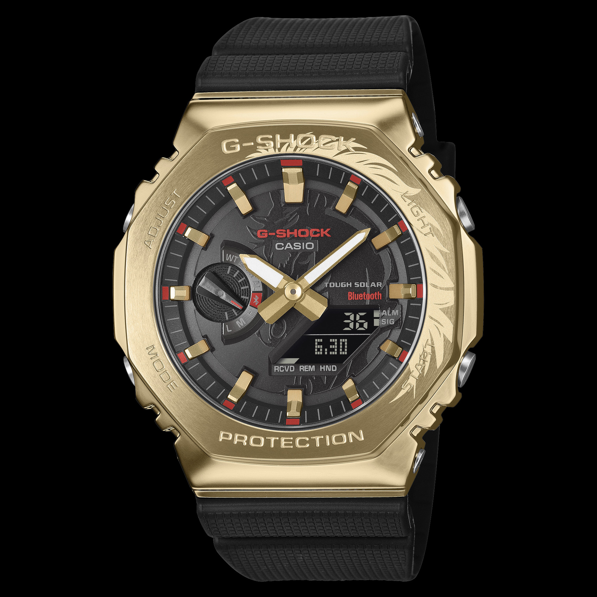 La GBM-2100CX-9A de Casio est ornée du mythique cheval mille-li, qui apparaît en relief sur son cadran noir. La crinière du cheval est gravée sur la lunette en acier inoxydable de couleur or, et l'animal se retrouve sur le fond métallique du boîtier. Le boîtier et le bracelet de cette montre sont en résine noire, avec des accents rouges sur le cadran.