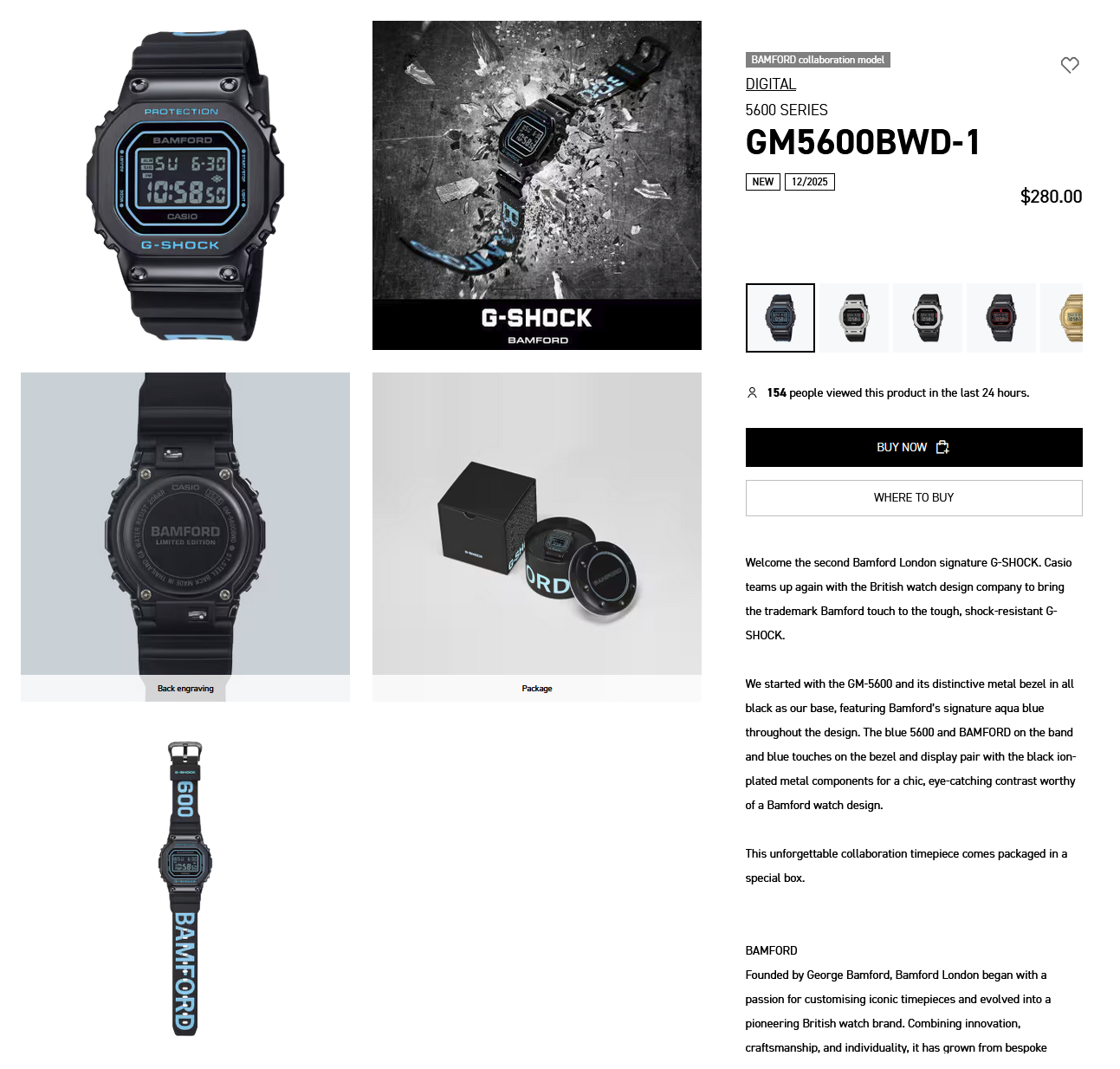 Casio a finalement réalisé sa dernière dernière collaboration G-Shock avec Bamford London, disponible à la vente aux Etats-Unis. Le nouveau modèle - basé sur la plateforme GM-5600 - est maintenant listé sur la boutique officielle américaine de Casio avec un prix de détail de 280 $.