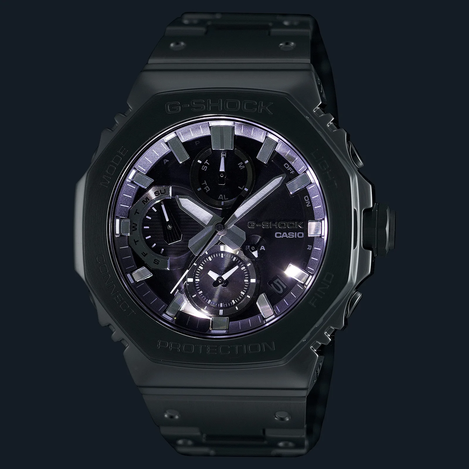 Ce modèle reprend le design octogonal classique de la B2100, mais sa construction est entièrement métallique. Le boîtier et le bracelet sont en acier inoxydable, avec un mélange de finitions brossées et polies. Casio indique que la lunette a été fabriquée selon un processus en plusieurs étapes comprenant le forgeage, le découpage et le polissage, avec une finition circulaire sur le dessus et une finition miroir le long des pentes.