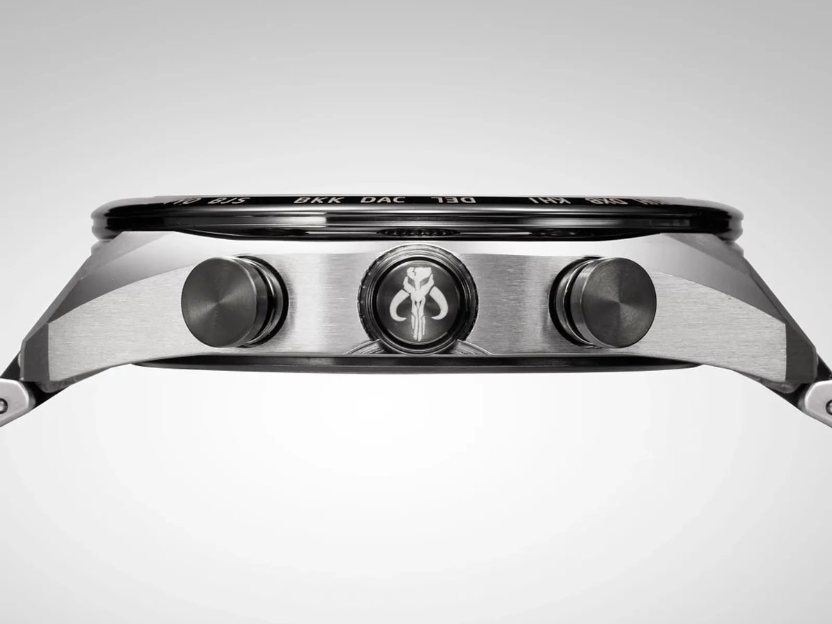 Le design général est relativement sobre. Le cadran noir texturé comporte trois sous-cadrans et des index argentés appliqués, la plupart des références au Mandalorien étant dissimulées dans les détails. Un emblème de mythosaure est gravé sur la couronne, tandis que le fond du boîtier est gravé du texte "The Mandalorian" à côté de son casque emblématique.