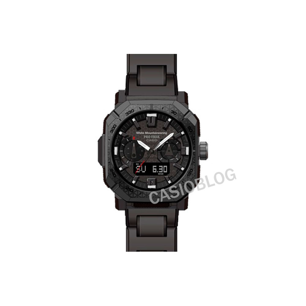 Le PRW-B1000WM-1 a été révélé sur , via les canaux tiers de Casio la PRW-B1000WM-1 sera disponible en février 2026. Il s'agit de la deuxième collaboration entre Casio et la marque de mode japonaise White Mountaineering, après la PRJ-B1000WM-1 d'entrée de gamme PRJ-B001WM. Cette nouvelle itération utilise le châssis haut de gamme PRW-B1000. La lunette en acier présente un motif triangulaire distinctif - un élément caractéristique de la marque - et est probablement protégée par un revêtement ionique (IP) afin d'atténuer les rayures de surface. Les accents mécaniques comprennent une trotteuse rouge et un marqueur rouge sur le sous-cadran de 9 heures, lui-même inspiré d'un piton d'escalade traditionnel.