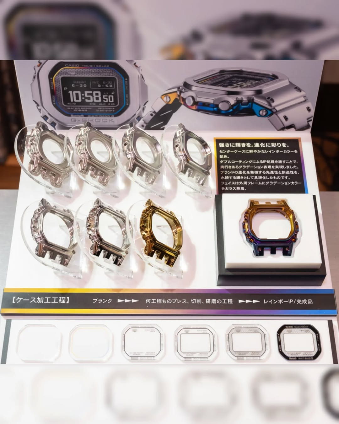L'un des clichés les plus clairs montre également la construction en couches du boîtier. Plusieurs coques métalliques non finies sont présentées à côté d'une unité traitée arc-en-ciel, afin d'illustrer le processus d'usinage et de finition en plusieurs étapes. Le profil latéral montre un autre détail qui n'était pas aussi évident auparavant. La lunette, le boîtier et la structure interne semblent plus segmentés que sur les anciens modèles GMW-B5000. Les transitions entre les surfaces en acier poli et la structure interne colorée sont très nettes. Les vis et les poussoirs présentent également un léger contraste de tonalité.