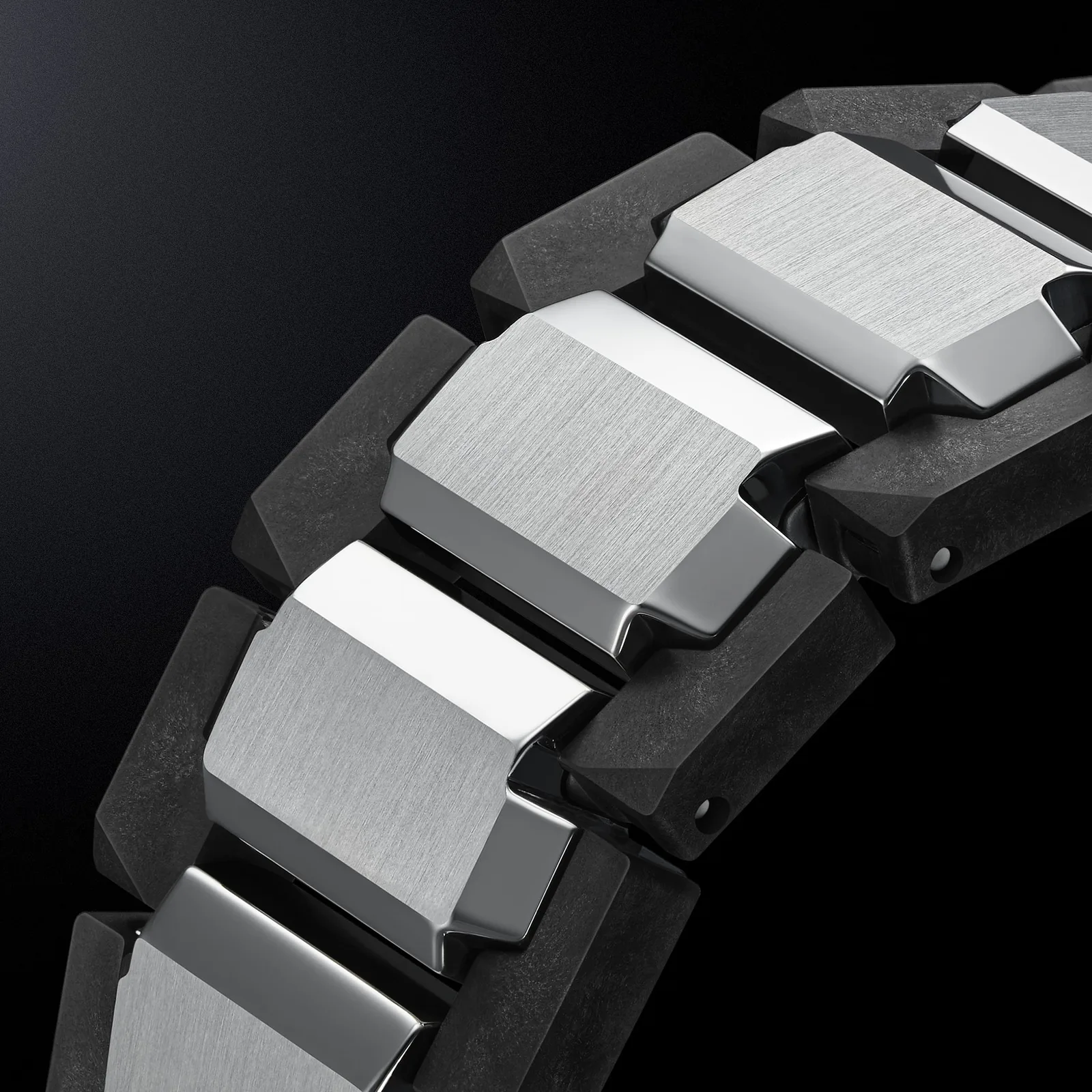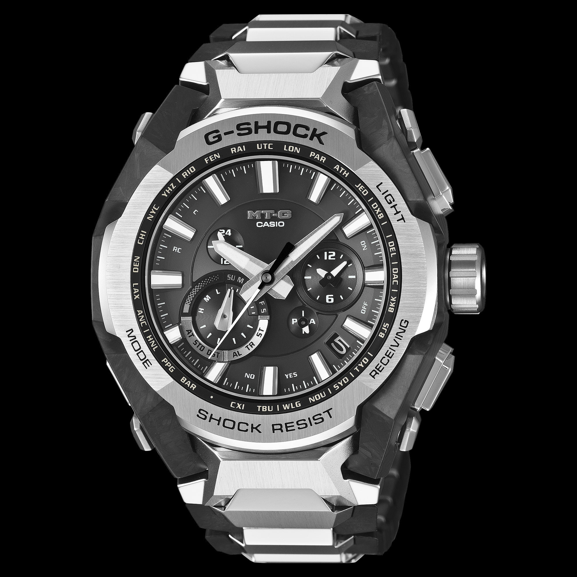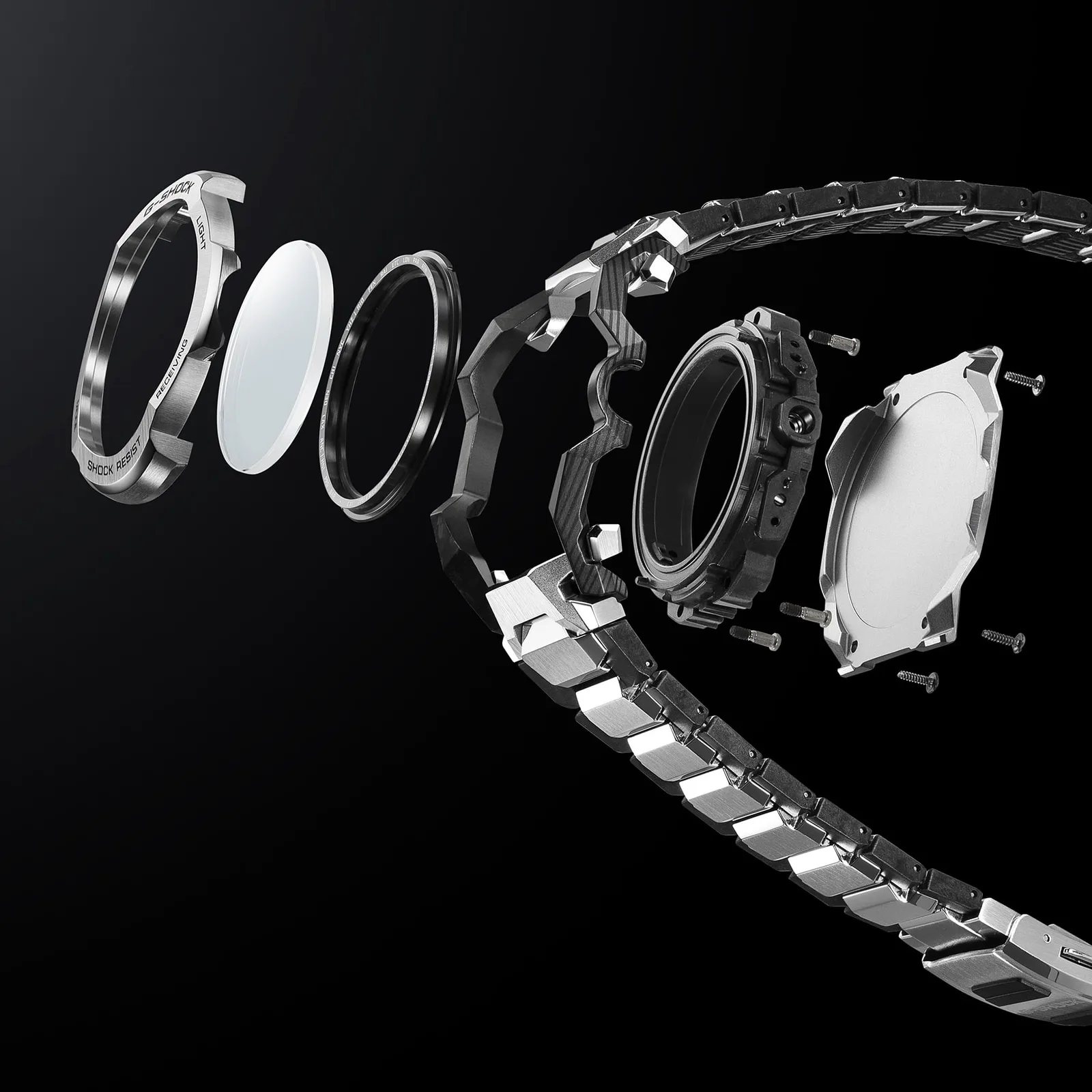 Le principal argument de vente de la MTG-B4000D sera sa construction en couches qui utilise de la résine renforcée par des fibres de carbone et de l'acier inoxydable. Casio décrit cette construction comme une évolution de son approche de protection à double noyau, le cadre en carbone étant destiné à absorber les chocs tandis que l'extérieur en métal assure une rigidité et une protection globales. Les schémas éclatés partagés par Casio montrent clairement que le cadre, la lunette et le fond du boîtier fonctionnent comme des éléments structurels distincts plutôt que comme une coque monobloc unique.