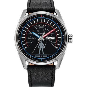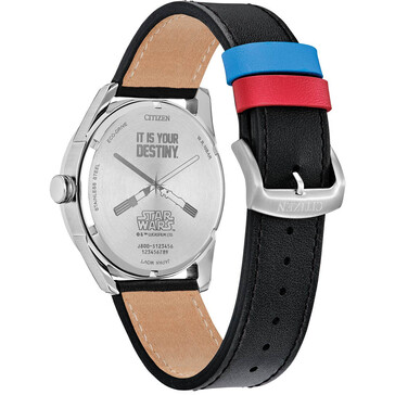 Le cadran affiche un graphique du duel emblématique entre Luke Skywalker et Dark Vador sur Cloud City dans L'Empire contre-attaque. La silhouette de Skywalker est visible à six heures, tandis que le casque de Vador est présent en haut du cadran. La montre utilise des aiguilles rouges et bleues pour représenter leurs sabres laser, qui sont complétées par des attaches assorties sur le bracelet en cuir noir.