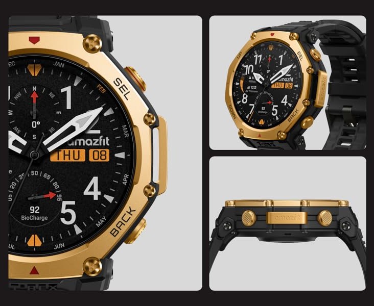 La smartwatch Amazfit T-Rex 3 Pro Black Gold (48 mm) présente les mêmes caractéristiques que la version Tactical Black. Elle dispose d'un écran AMOLED de 1,5 pouce, d'une luminosité de 3 000 nits et d'un verre saphir résistant aux rayures, entouré d'une lunette en titane de couleur dorée. Les outils comprennent six systèmes de navigation par satellite avec des indications détaillées, plus de 180 modes sportifs, y compris le rucking et la plongée récréative, et le suivi du niveau d'énergie BioCharge. De plus, il y a une lampe de poche intégrée en deux couleurs et la prise en charge des appels Bluetooth.