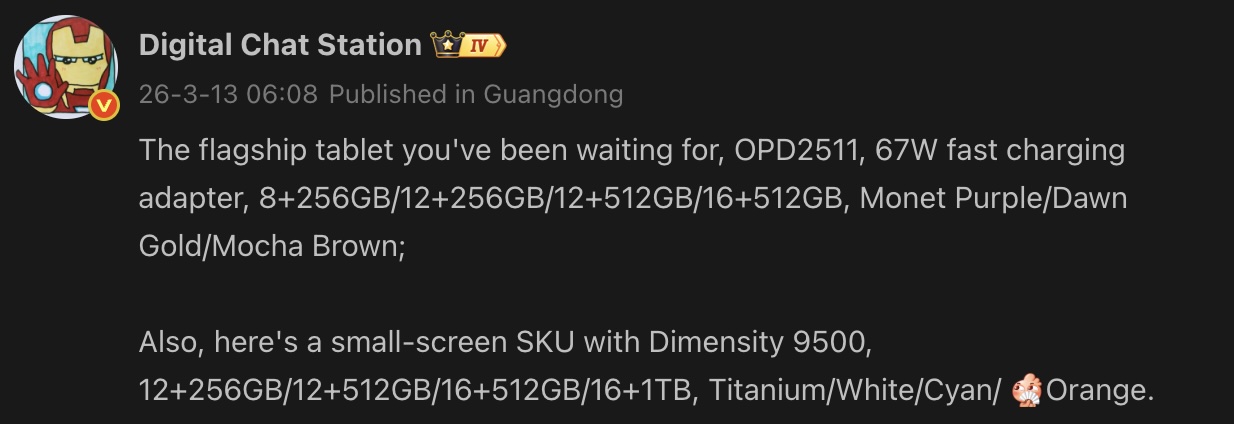 L'un d'entre eux est une tablette qui porte le numéro de modèle "OPD2511" Cependant, la fuite ne révèle pas le nom exact de l'appareil. L'informateur a révélé que l'appareil serait disponible en quatre configurations de mémoire : 8GB/256GB, 12GB/256GB, 12GB/512GB et 16GB/512GB. La prochaine tablette phare d'Oppo devrait être disponible dans les coloris Monet Purple, Dawn Gold et Mocha Brown. La fuite fait également allusion à la prise en charge d'une charge rapide de 67W.