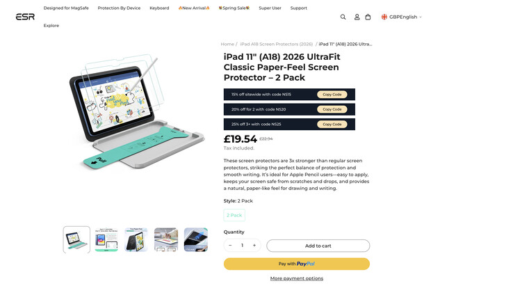 Selon ESR Techun nouvel iPad d'entrée de gamme est sur le point de voir le jour. Bien qu'aucune annonce publique n'ait encore été faite par Apple, ESR Tech fait déjà la promotion de protections d'écran au toucher papier pour l'iPad de 12e génération. Bien qu'encore en ligne au moment de la publication, nous avons intégré les images ci-dessous pour le moment où ESR Tech retirera son annonce.