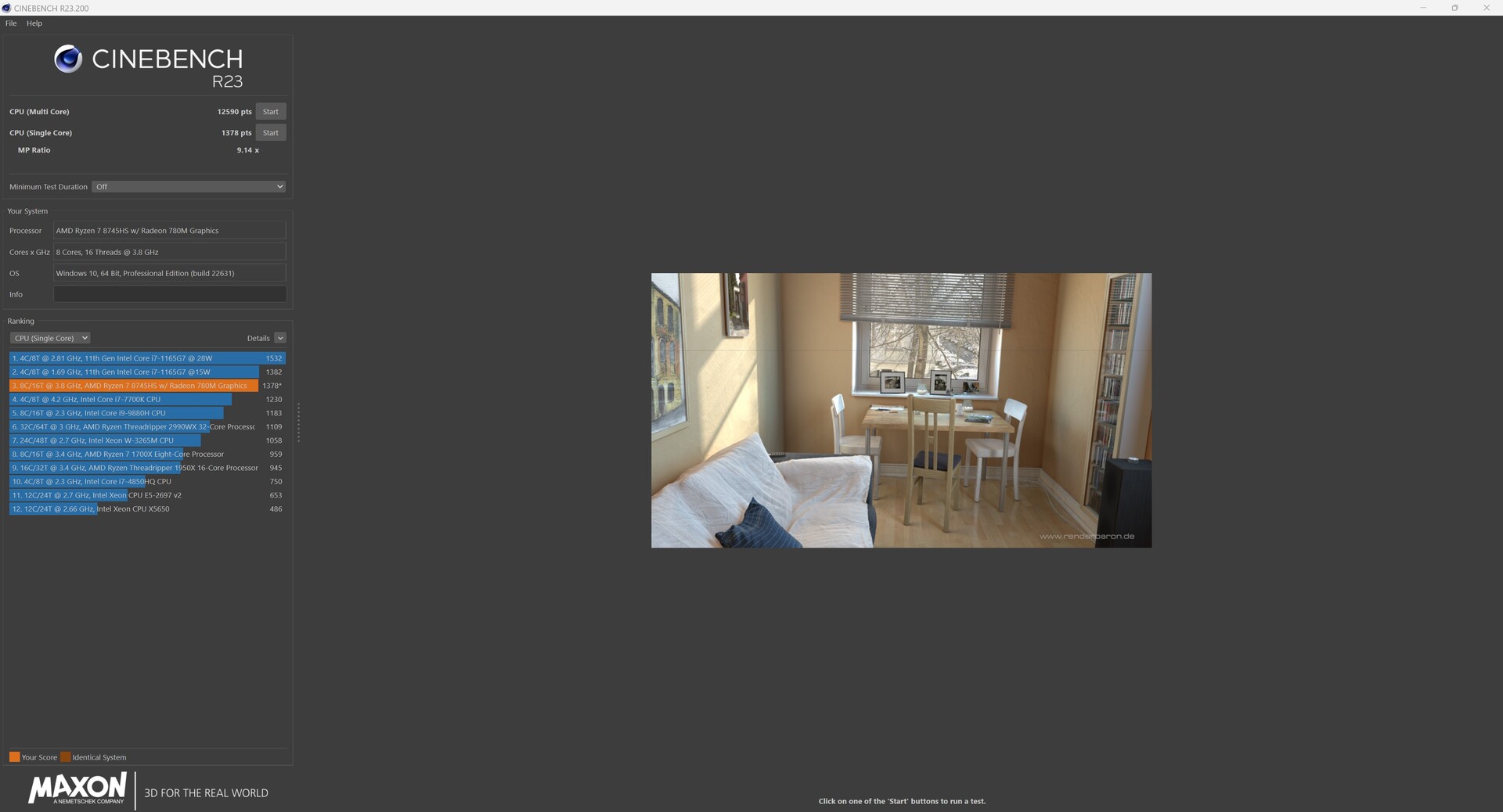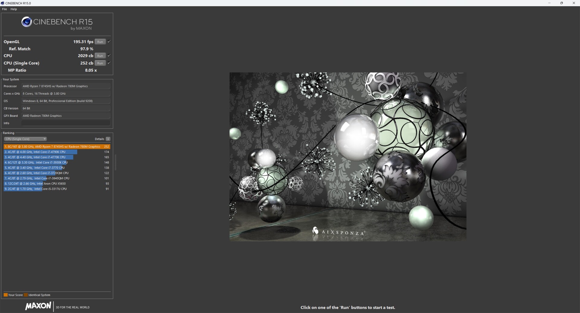 L'Alliwava H90 Pro est équipé d'un puissant processeur AMD Ryzen 7 8745HS un processeur à 8 cœurs basé sur l'architecture Zen 4. Contrairement aux modèles plus grands tels que le Ryzen 7 8845HS ou le Ryzen 9 8945HS le 8745HS ne dispose pas d'un NPU dédié pour accélérer les applications d'intelligence artificielle. Les utilisateurs qui travaillent spécifiquement avec des charges de travail d'IA devraient donc opter pour un modèle avec une unité d'IA intégrée. Dans les tests de performance, l'Alliwava H90 Pro se positionne juste derrière le Chuwi Aubox, qui est également équipé du Ryzen 7 8745HS.