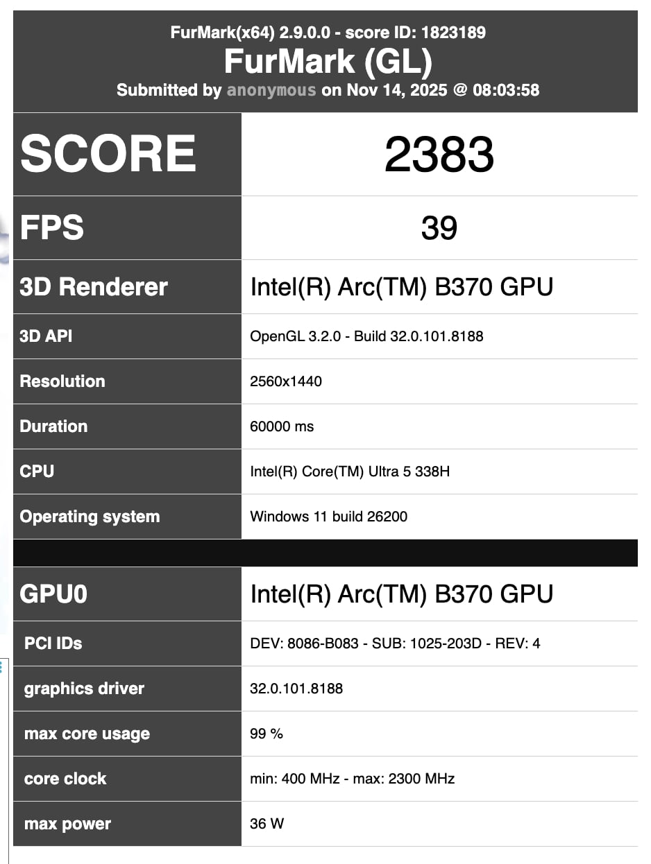 À cette fin, le listing FurMark reproduit ci-dessous confirme que le benchmark a été exécuté sur un appareil équipé d'un Core Ultra 5 338H avec la même résolution que toutes les versions précédentes du OneXPlayer X1. Par conséquent, il semble probable que ce benchmark se rapporte au même appareil Panther Lake que celui récemment trouvé sur Geekbench.