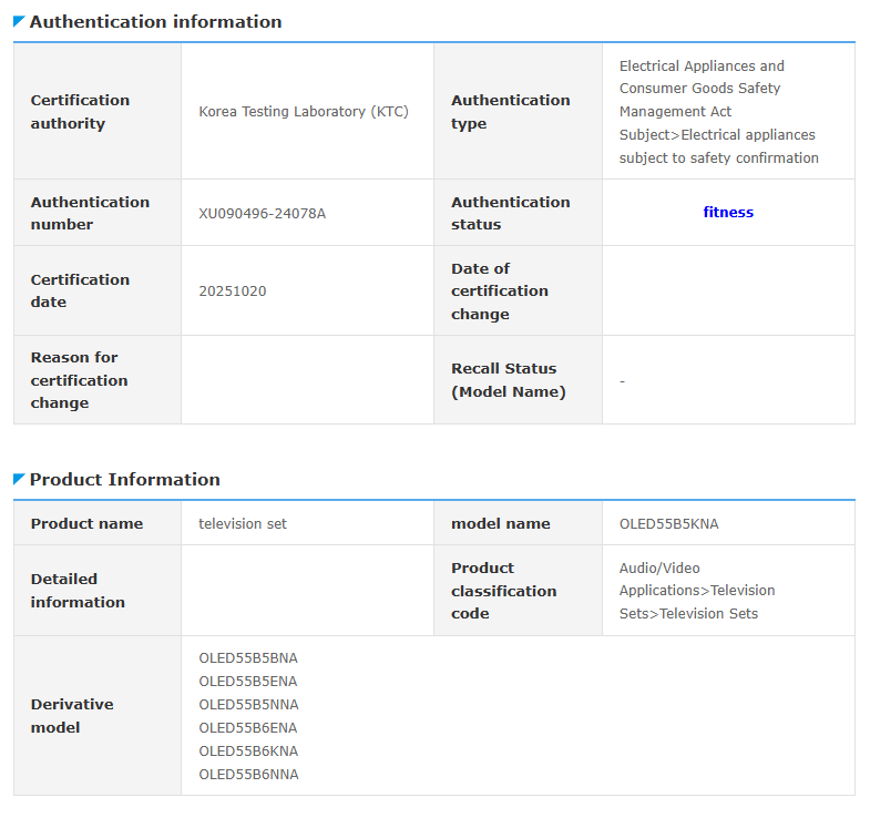 Il se pourrait que ces numéros de modèle B6 se rapportent à une prochaine version 2026 de ce produit. Il convient de souligner que, étant donné qu'ils sont répertoriés sous le même certificat, le téléviseur OLED55B5KNA est susceptible de partager le même matériel que l'OLED55B6ENA, l'OLED55B6KNA et l'OLED55B6NNA.