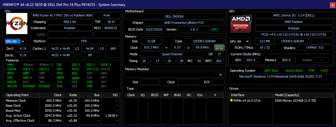 | Dell Pro 14 Plus PB14255 GH77W AMD Ryzen AI 7 PRO 350 ⎘ AMD Radeon 860M ⎘ 32 Go Mémoire, 1024 Go SSD | Prix de liste: 1630 Euro | 1.6 kg | 22 mm | 14.00" 1920x1200 162 PPI IPS LED | |