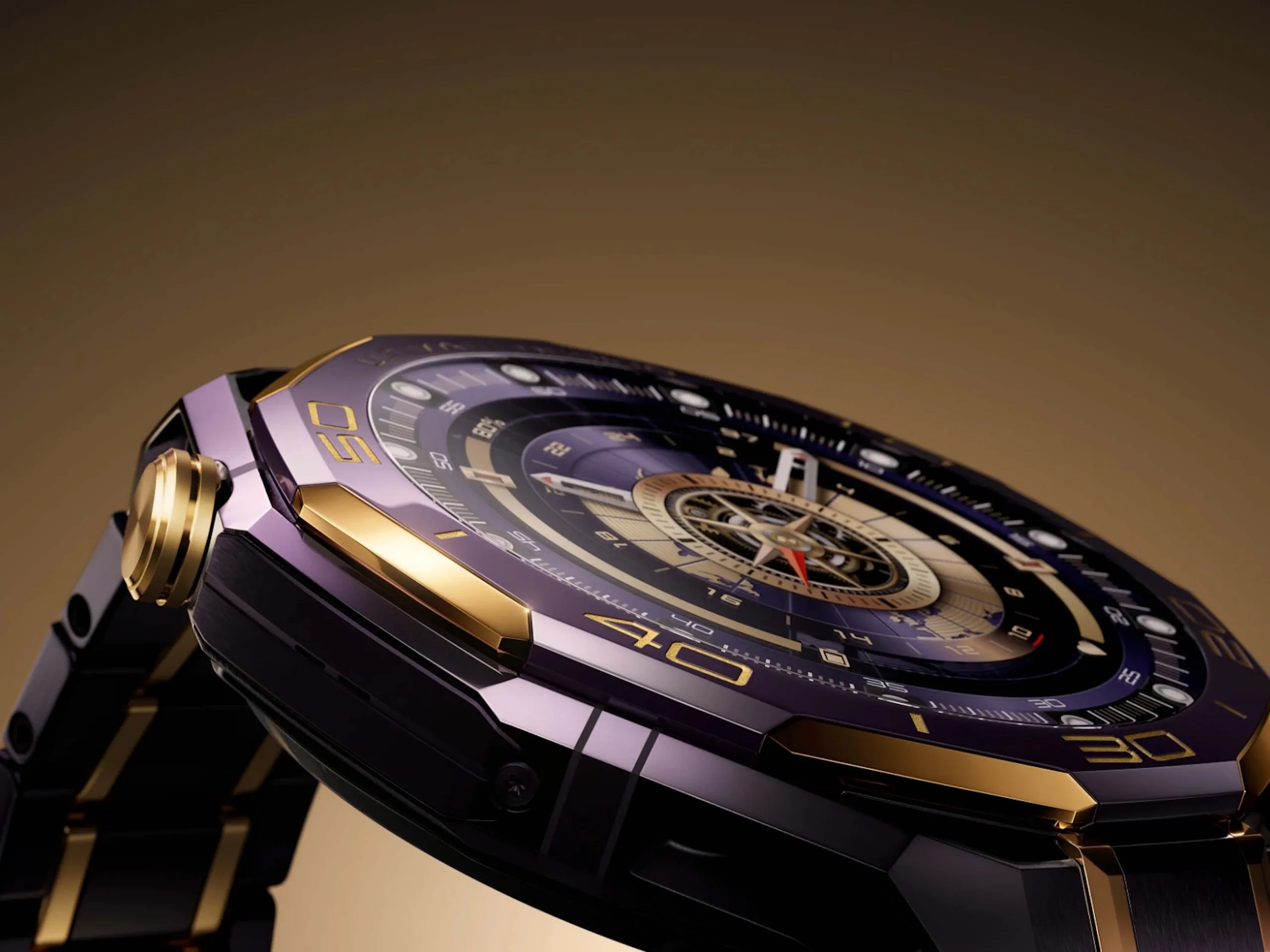 La Huawei Watch Ultimate Design Royal Gold a un design violet et or, avec une lunette en céramique et des accents en or 18K et 24K. Le boîtier est fabriqué à partir d'un métal liquide à base de zirconium, réputé particulièrement résistant, et le boîtier creux contribue à le rendre plus léger. La montre est livrée avec un bracelet durable en alliage de titane violet et or, le cadran est protégé par un verre saphir et la couronne est également plaquée d'or 18 carats.