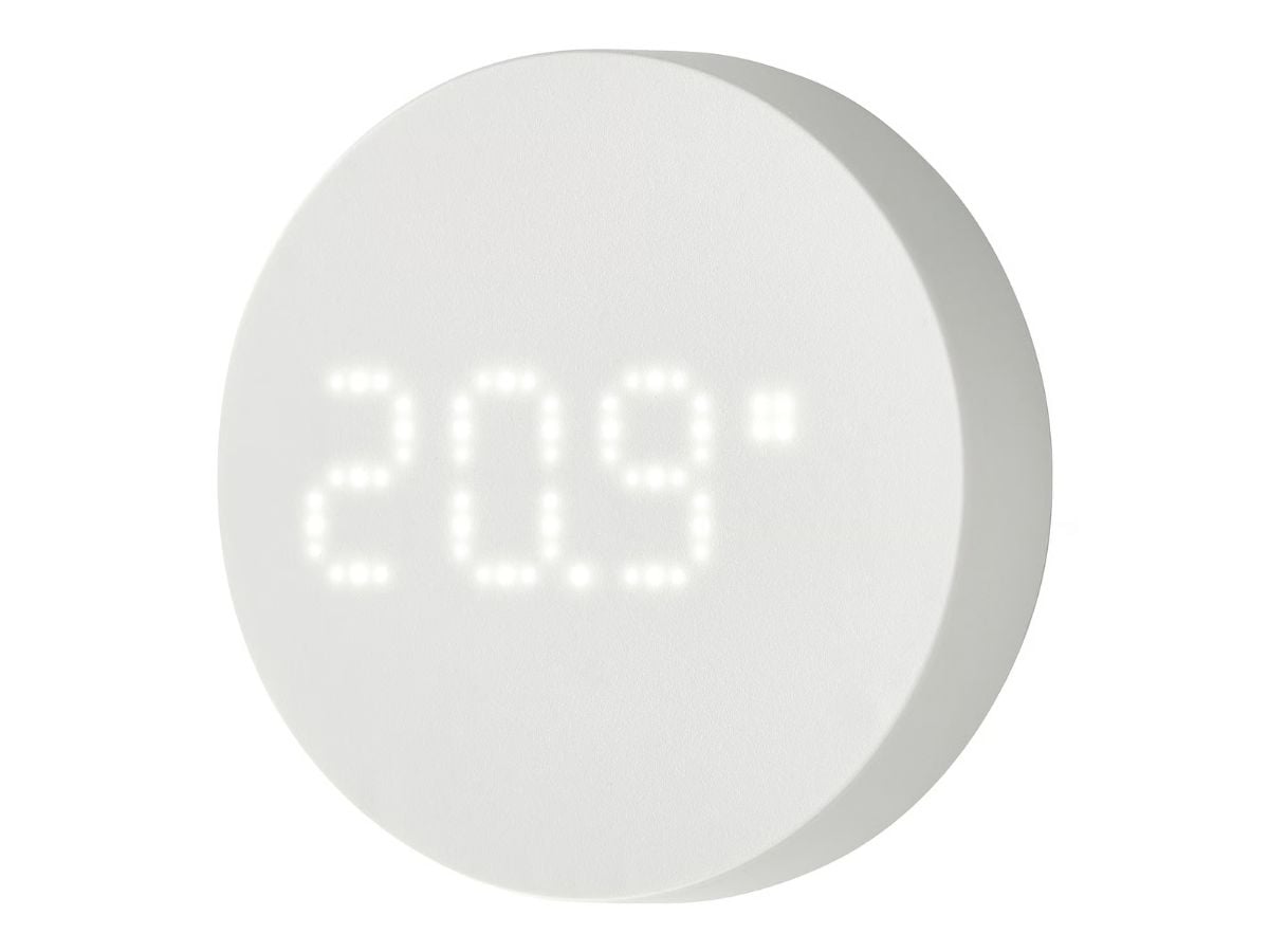 Le Timmerflotte d'IKEA est un appareil rond doté d'un affichage numérique sur sa face avant. Les utilisateurs peuvent passer d'une mesure de la température et du taux d'humidité de la pièce à l'autre en appuyant sur un bouton. Il est conçu pour être connecté au hub IKEA Dirigera, ce qui permet de le gérer à distance et de le relier à des appareils intelligents via l'application intelligente IKEA Home.
