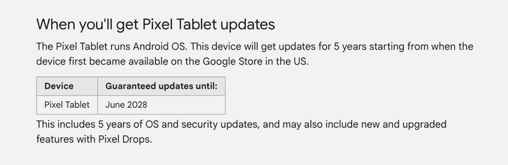 La tablette Google Pixel a été lancée en juin 2023 avec Android 13. Initialement, Google n'avait promis que trois mises à jour majeures de Android et des mises à jour de fonctionnalités jusqu'en juin 2026, même si la tablette Pixel était censée recevoir des correctifs de sécurité pendant cinq ans. Aujourd'hui, Google a confirmé sur son site d'assistance https://support.google.com/googlepixeltablet/answer/13399216?hl=en que la tablette Pixel recevra finalement des mises à jour du système d'exploitation pendant cinq ans.