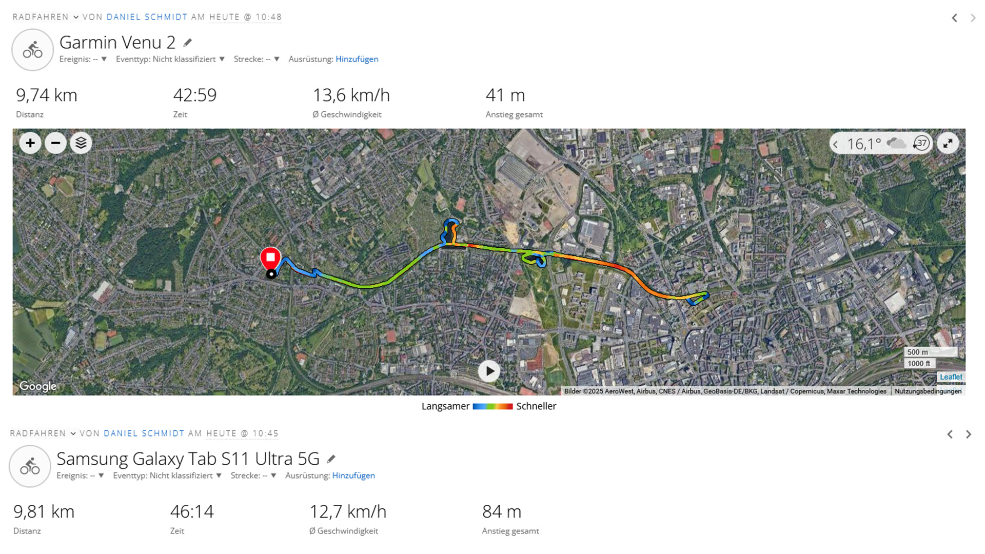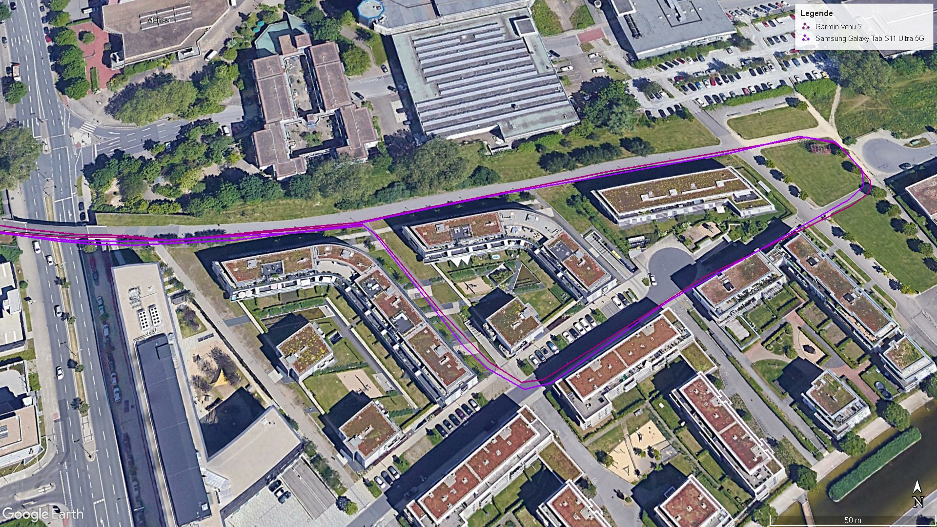 Nous avons également comparé notre tablette Samsung avec la Garmin Venu 2 lors d'une sortie à vélo. Elle a suivi notre itinéraire avec précision et ne s'est que légèrement écartée du chemin que nous avions emprunté. Il convient de noter que ces résultats s'appliquent probablement à la version 5G que nous avons testée, car la version Wi-Fi de la petite Tab S11 que nous avons testée présentait des capacités de positionnement nettement inférieures.